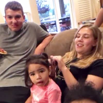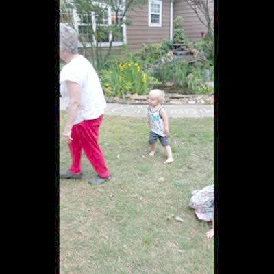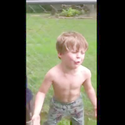 A tot boy stands on a backyard porch and touches a frog, but is scared. It jumps on his head and he screams "get it off". His dad laughs hysterically, and the boy laughs and high-fives him.