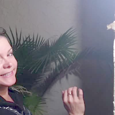 A woman tries to pet a tree frog and it jumps and pees on her face outdoors.