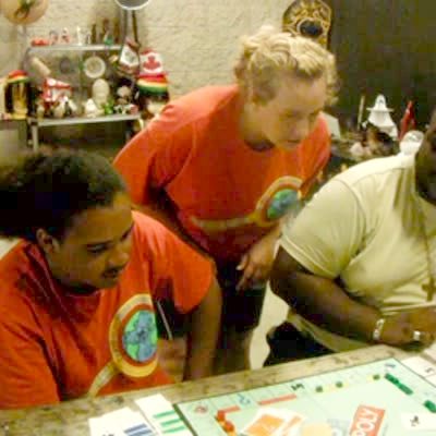 A man plays Monopoly and screams/ runs when a woman places a frog on the board at :28.
