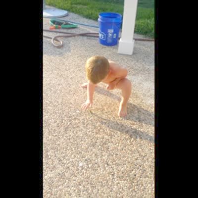 Baby boy pokes a frog with a stick while crawling. Suddenly he grabs the frog and put it in his mouth. Gross.