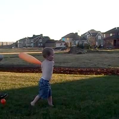 A man plays ball with a little boy with a bat outdoors. The boy swings his bat, hitting an older boy in the crotch. The older boy gets mad and hits the little boy. The man laughs, telling the camera this is an AFV moment.