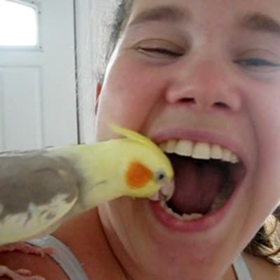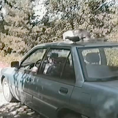 Bird stands on steering wheel. The driver turns while the bird holds on