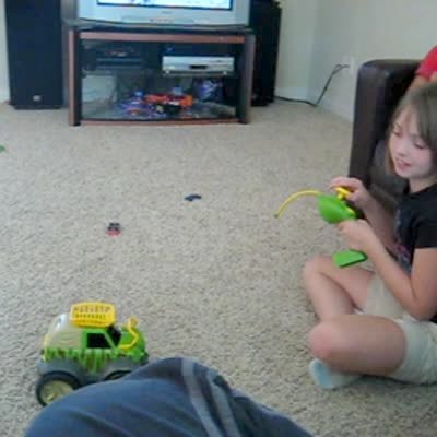 Black lab puppy barks at remote controlled car young girl is playing with. Dog sits on tot boy's head.