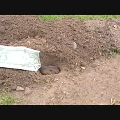 Gopher in the ground pops its head out of a hole where a dollar bill is. It takes the money into the hole.