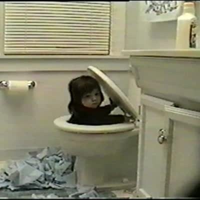 A boy holds a newspaper, crouched on a toilet with a dog in his sweatshirt, making it look like the dog is using the bathroom while reading. The woman behind the camera acts as though she's walked in on him.