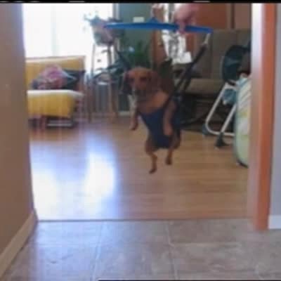Dachshund dog sits in a baby's jolly jumper chair. Funny visual.