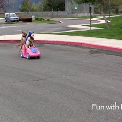A small dog sits in a child's car toy stroller on a road. Another small dog paws at the back of the stroller and pushes it up and down a road. Multiple cuts.