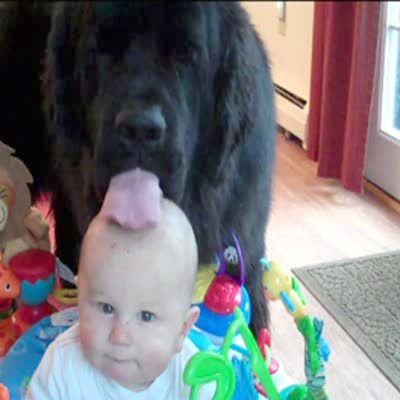 Giant newfoundland dog licks the back of baby boy's head as baby sits in bouncy seat.