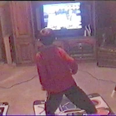 Kids playing dance video game. Camera pans across 2 boys doing it and then a baby in a jolly jumper. Siblings. Brothers.