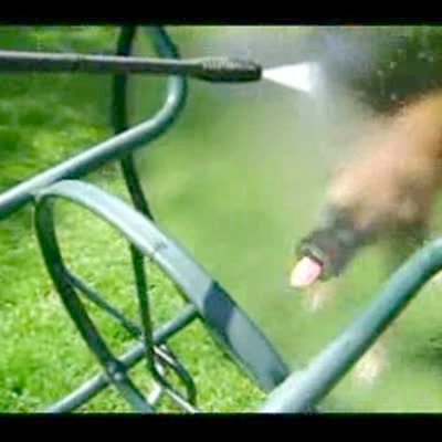 Brown boxer dog licks at water through a hole in the patio table as man sprays the underside of the table with a water hose.