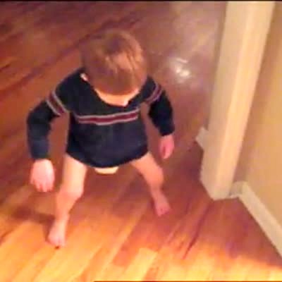 Tot boy walks funny around the house because his diaper is full and drooping between his legs.