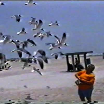 Woman feeds a flock of birds on the beach, the seagulls hover over her stuck in a stiff wind.