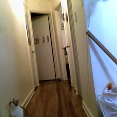animals: Short clip of pet monkey hitting/clobbering camera in house.
