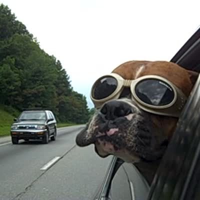 Boxer dog leans out of car window wearing goggles & his jowls flap in the wind.