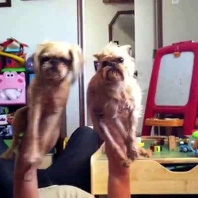 A man lifts weights using two small dogs indoors, amusing the two women behind the camera.