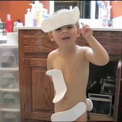 Tot boy has mom's maxi pads stuck to his head body. Boy says "I put one on my willy." Mess.