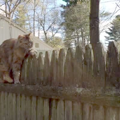 A cat walks funny along the top of a fence in the yard and uses one paw to hold the top of the posts.