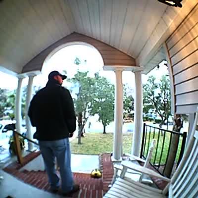 A man stumbles off a porch and into the bushes on the walkway of a house when he tries to exit through the front door with trash in his hands. A woman who was standing on the porch and asks him if he's okay. Home surveillance camera.
