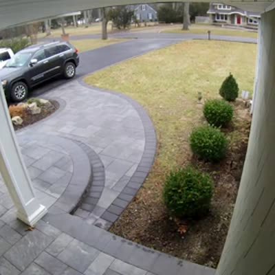 A woman walks outside of her house and slips and falls down the front step. Home security footage.