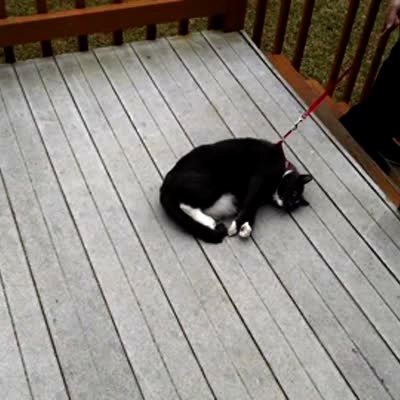 A man tries to take a cat for a walk on a porch with a leash and harness as the cat is dragged along the ground.