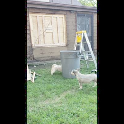 A goat in the garage stand on a garbage can. The lid flips over and the goat falls in the garbage.