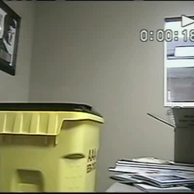 "Garbage Can Klutz" A senior man starts to wheel a garbage can down his driveway, then it falls on him, and he calls to his wife for help. Security footage.