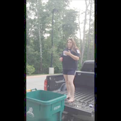 A woman rushes to get his trash can out on trash day, when she yanks at the bin and it falls on top of her and pours rain water all over her while she sits in a yard. Security footage.