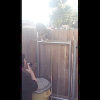 The man with the camera shows a mess in the living room and kitchen after the garbage cans got emptied. The man calls a dog into the house and the dog walks in through the doggy door. It sees the mess and walks right back out the door. The man calls the dog back and the same thing happens. Another clip plays and the dog lays on the floor and looks away from the man while he questions it about the mess.