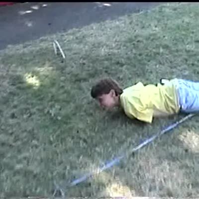 Young boy swings from a rope tries to land inside of a trash can. Only 1 of his legs lands in the can he gets hit in the groin. Garbage.