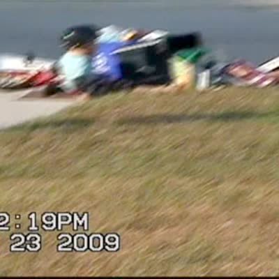 Teen boy rides in homemade cart made of a trash can, patio chair, & a scooter. It falls apart & teen falls down.