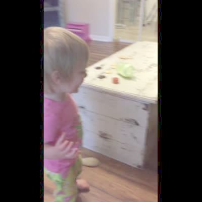 A tot gir puts food on her Dachshund dog's back and laughs as the dachshund tries to get it but can't reach.