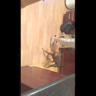 A pit bull puppy dog bites a young girl's butt then does not let go when she stands up and walks around the living room.
