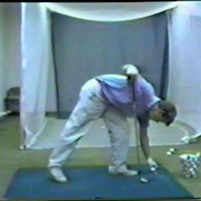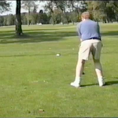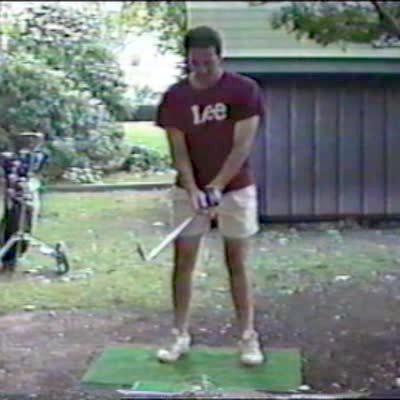 golf - backyard golfer chips shot up and into his hat. Date on screen 1992.