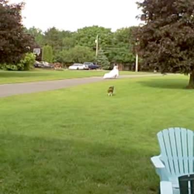 A man in a wedding dress walks over to the groom, pretending to be his bride-to-be at a wedding for the traditional first look. When the groom turns around he laughs when he sees his friend in the white dress.