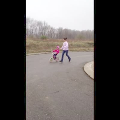 A woman falls over as she walks next to her young granddaughter while rides her bicycle.