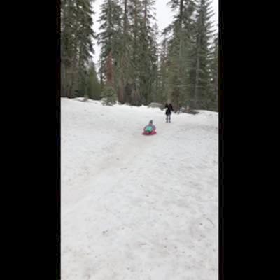 A man slips and falls in the winter snow while he chases after his young granddaughter when she continues to sled down a hill after he stops her.