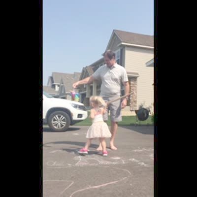 A man holds a small pinata up for his granddaughter to hit in the driveway outdoors. The little girl swings her stick and hits the man in the groin.