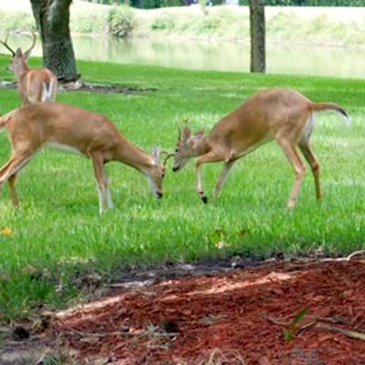Several deer graze outdoors when a Maine Coon cat runs out and scares them away.