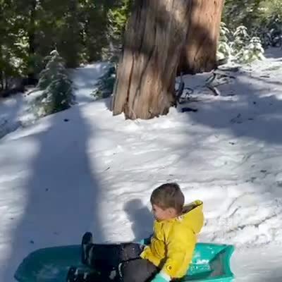 A young boy sleds down a snowy hill outdoors towards a parked car. He slides underneath the car.