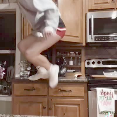 A teen girl sings to a song that plays while the huddles on the counter then she loses her balance and falls off and hangs off the cabinet door by her underwear in the kitchen.