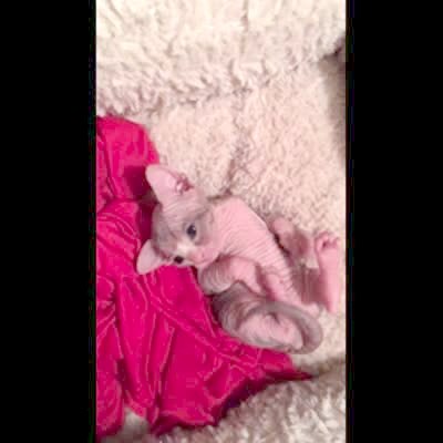 Hairless cat wearing a sweater tries to get out of clothes by backing up. The cat tips and falls backwards 3 times.