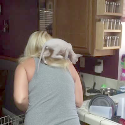 A hairless cat climbs into a dishwasher and up a woman so it can get on a kitchen counter.