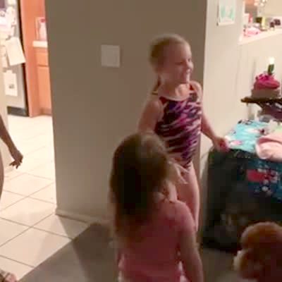 A young girl does a magic trick in a living room in which she holds up cards and her father guesses them. He always guesses correctly, because her younger boy brother holds up his hands to share the number behind her back. The young girl yells "how do you do that?"