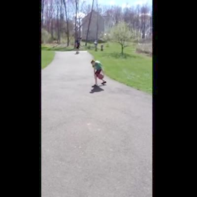 4 girls walk in big hamster wheel at park, one tries to hang from top, knocks all four girls down. Playground.