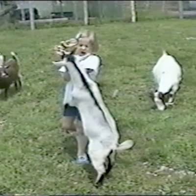 Girl at petting zoo/farm tries to feed goats but they attack her. She says,"I HATE that goat"
