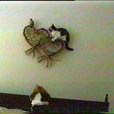 Cat tries to get bird off heart wall decoration, falls