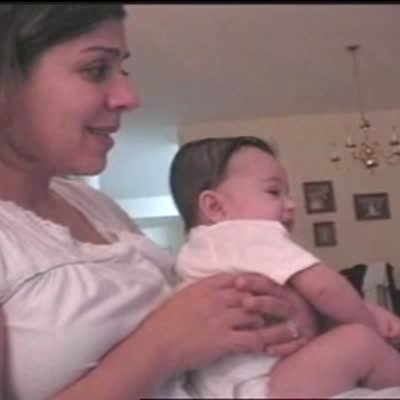 A woman tells her baby boy to say "Hi mommy" and the girl says "Hello!" indoors.