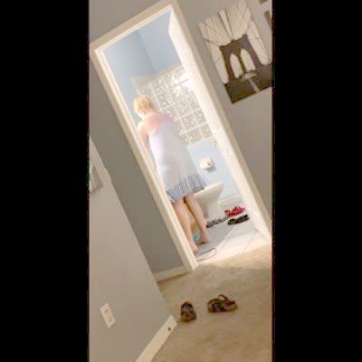 A woman screams when she walks out of the bathroom and her teen daughter says hello.