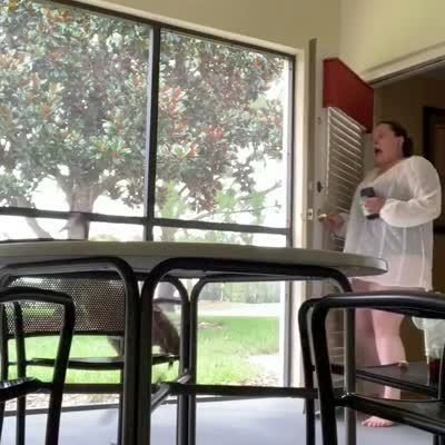 A woman holds a Blue Heron bird and cuts a fishing line that's stuck on the bird. She uncovers the bird's head and the bird growls and bites at her repeatedly before they cover the bird again and take the bird to their patio.