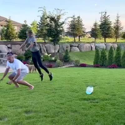 A woman tries to jump over a man, then he ducks and she falls forward in a yard.